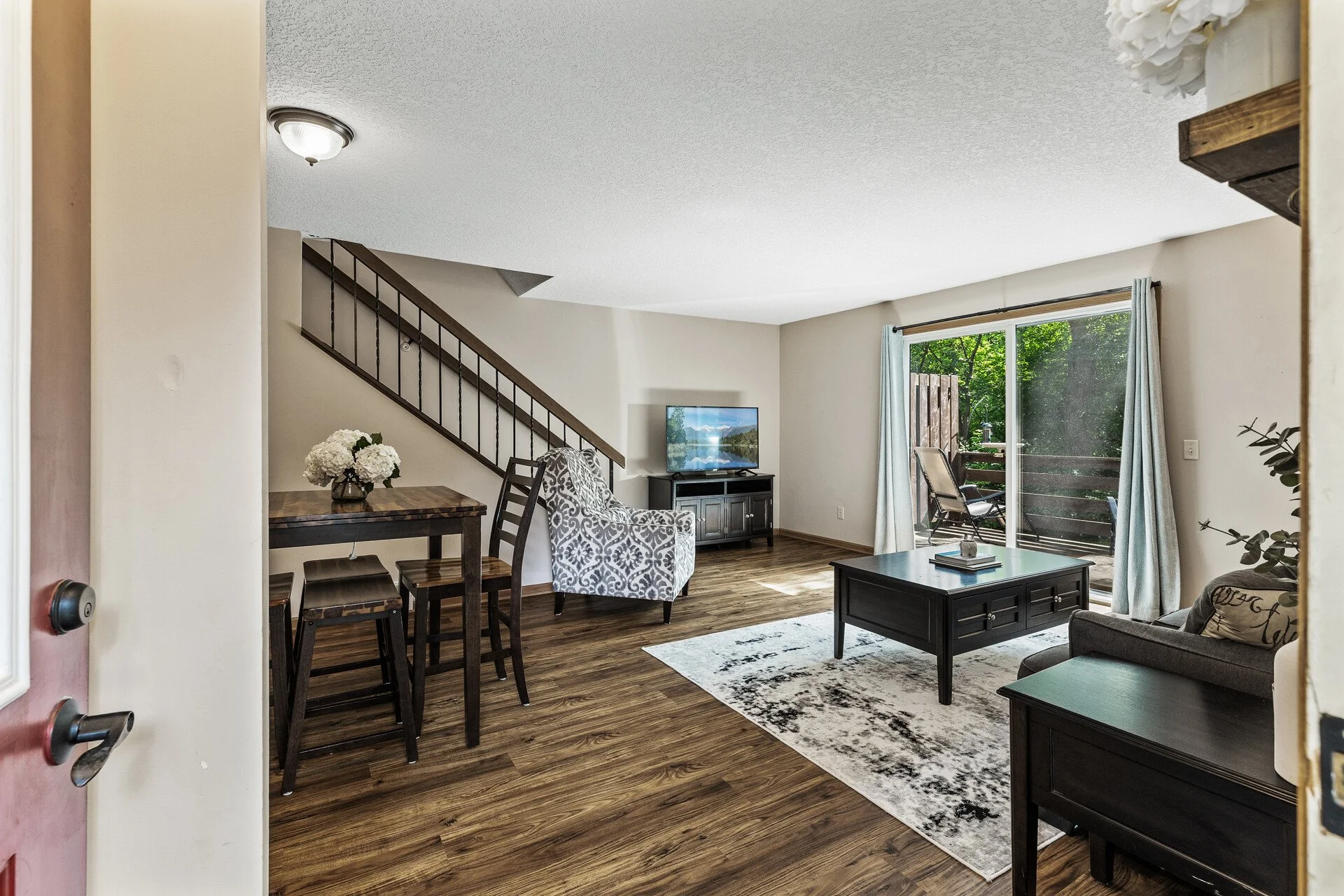 Welcome home to 5403 West Brenner Pass, a lovely end unit townhome in a serene wooded setting! This three level unit features two bedrooms, three bathrooms, and a finished lower level. The main level has newer LVP flooring throughout, a convenient half bathroom, functional kitchen with window, living room with space for a dining table and balcony off the living space. Upstairs you will find the two bedrooms and full walk through bathroom. Downstairs features storage, laundry, another half bathroom and cozy gas fireplace. Entertain outdoors in the spacious side yard surrounded by trees, on your private balcony overlooking the woods, or at the complex community room and outdoor pool. Close to 694, this conveniently located home is nearby restaurants, shopping, parks, trails and more. Come see it for yourself and move right in!